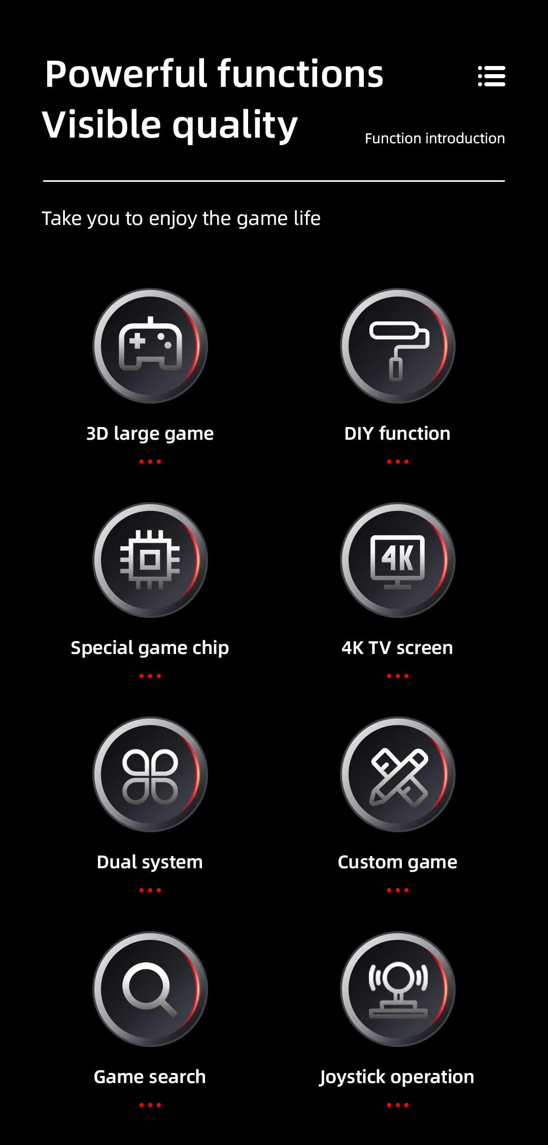 | Main Emulators | MAME / FC / GB / GBA / GBC / MD / SFC / PS1 / ATARI2600 / ATARI7800 | PSP, N64, C64, PS1, CPC1, CPS2, CPS3, ATARI, ATARI2600 | PSP, N64, C64, PS1, CPC1, CPS2, CPS3, ATARI, ATARI2600 | PSP, N64, C64, PS1, CPC1, CPS2, CPS3, ATARI, ATARI2600 | FC, SFC, MD, NEOGEO, GB, GBC, GBA, SMS, CPS1, CPS2, CPS3, PSP, PS1, GG | GB, GBA, Sega, PSP, NES, ND64, MSX2, LYNX, ATARI, ARCADE |