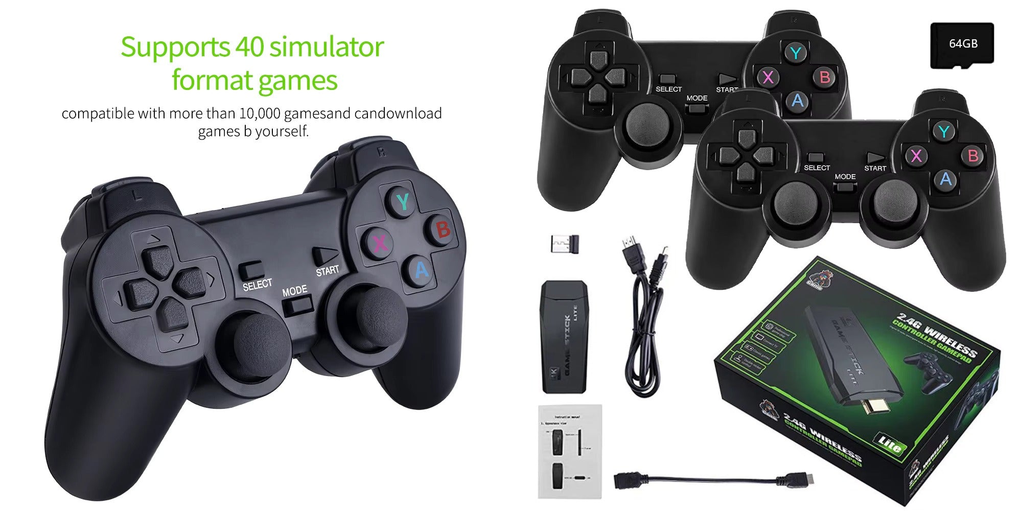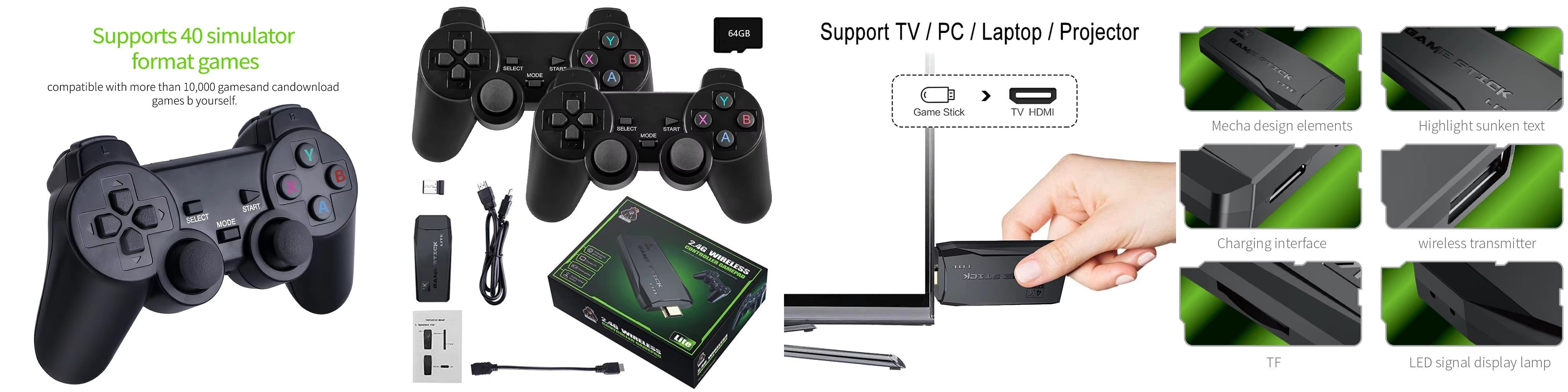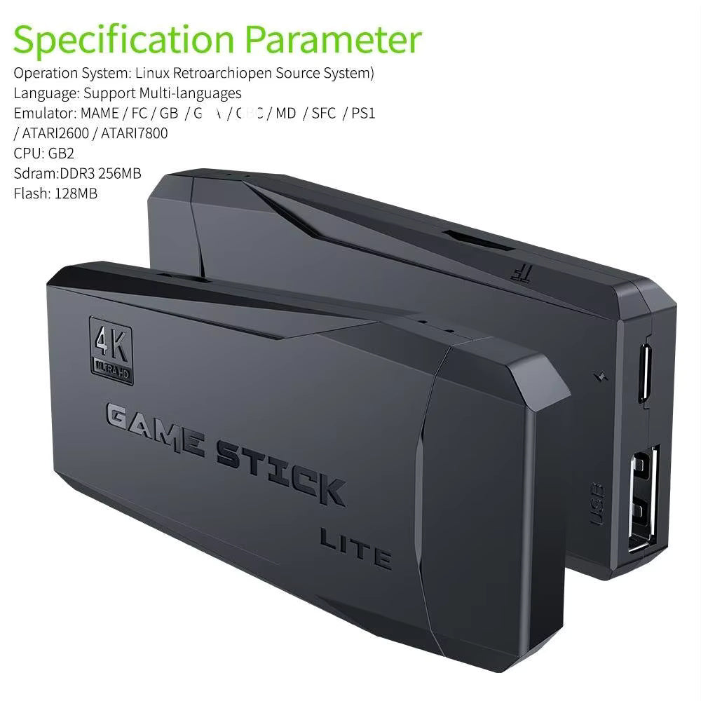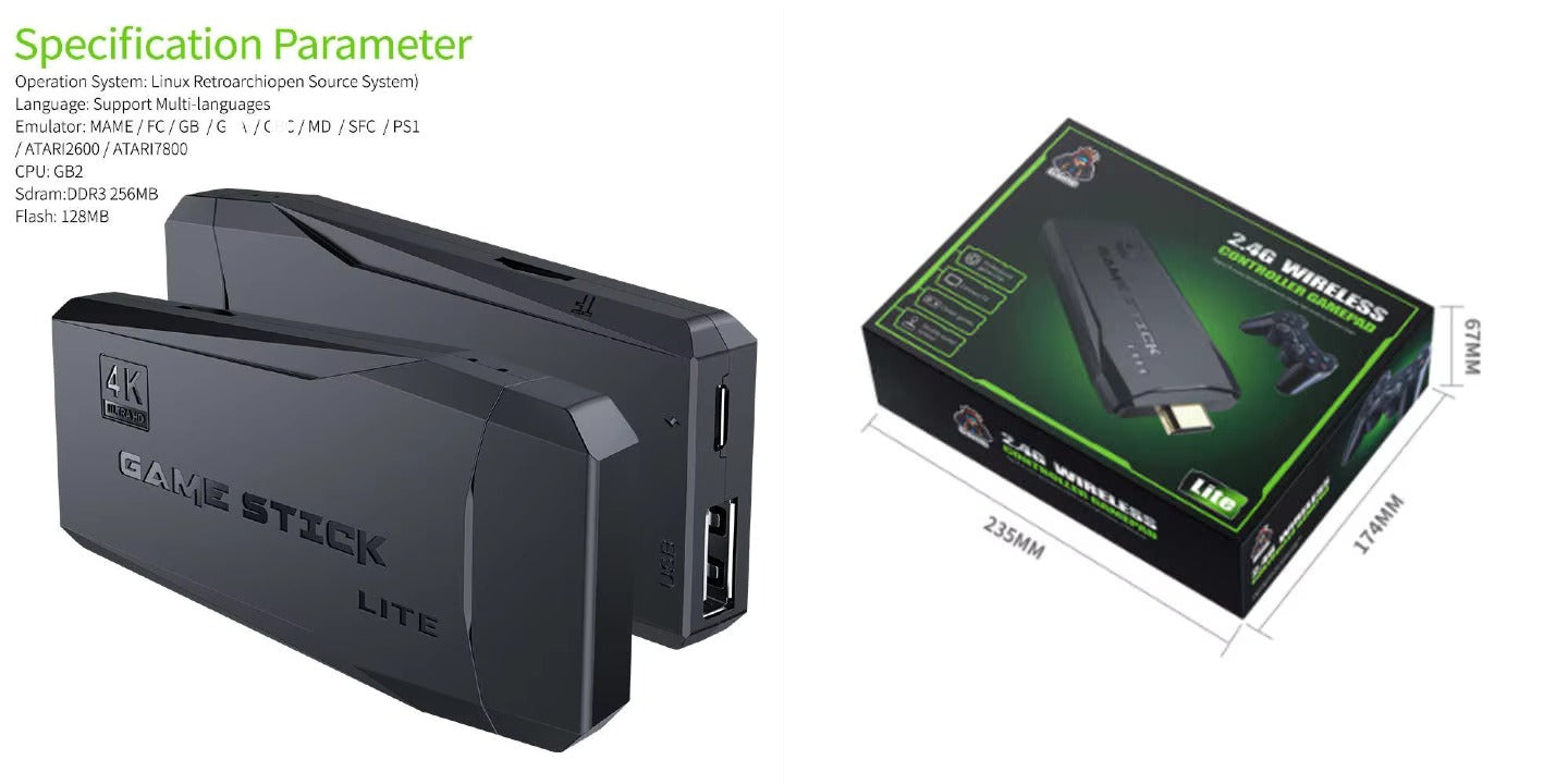 Stick Support 4k Resolution, TV Game Console Function Support Multi-Players. It comes with Wireless Controller Memory - 64 GB. Supports Game Formats e.g., CPS, PS1, FC, GB, GBA, GBC, MD, SFC, NGPC, PCE, WSC, SMS, GG.