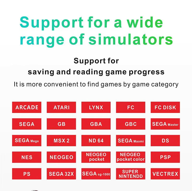 Main Emulators | MAME / FC / GB / GBA / GBC / MD / SFC / PS1 / ATARI2600 / ATARI7800 | PSP, N64, C64, PS1, CPC1, CPS2, CPS3, ATARI, ATARI2600 | PSP, N64, C64, PS1, CPC1, CPS2, CPS3, ATARI, ATARI2600 | PSP, N64, C64, PS1, CPC1, CPS2, CPS3, ATARI, ATARI2600 | FC, SFC, MD, NEOGEO, GB, GBC, GBA, SMS, CPS1, CPS2, CPS3, PSP, PS1, GG | GB, GBA, Sega, PSP, NES, ND64, MSX2, LYNX, ATARI, ARCADE |